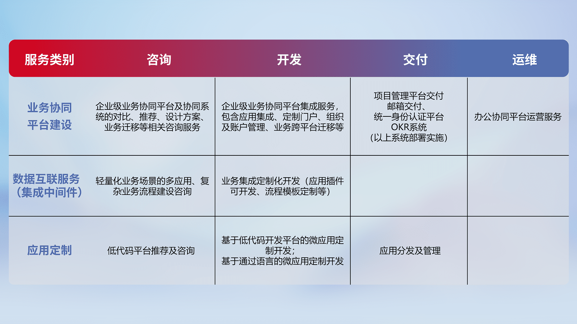 针对钉钉、、、、企微、、、、IDaas等平台级产品提供产品的规划、、方案、、、交付、、定制化开发等服务,,,实现如统一协同办公、、、、智能客户服务、、混合会议管理、、、、智能数据查询、、等业务场景,,实现数字化转型。。。