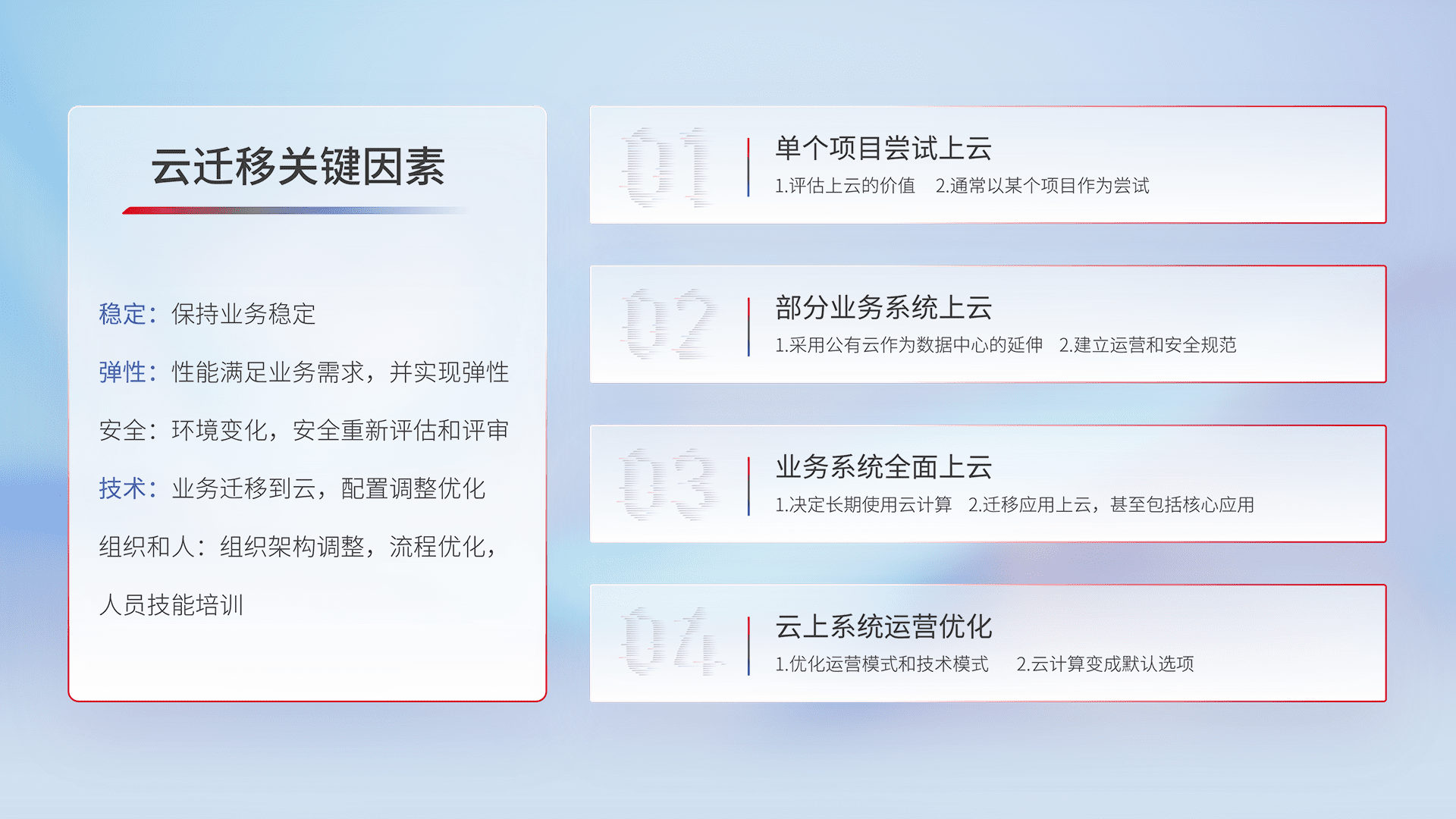 结合实际业务,,从规划设计、、、云平台选型、、、云原生改造、、、、数据迁移、、、、集成交付,,迁移全过程为客户识别最佳上云路径,,做好风险识别管理,,,,设计网络架构、、身份权限、、、安全审计合规、、操作审计、、、日志审计、、监控告警策略、、、多站点容灾设计等,,,,对云上基础设施进行整体规划,,,,提升IT治理水平,,以满足弹性、、高可用、、高性能的需求。。。。